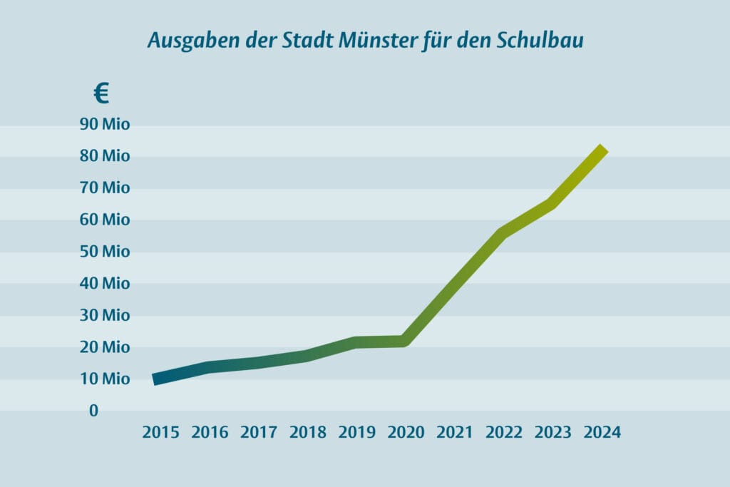Die Ausgaben sind dabei kontinuierlich gestiegen. Gab die Stadt 2015 noch zehn Millionen Euro für den Schulbau aus, waren es im vergangenen Jahr 81 Millionen Euro. Allein seit 2023 hat die Stadt elf Neu-, Um- und Ausbauten für Münsters Schulen fertiggestellt. Insgesamt befinden sich aktuell mehr als 40 Bauprojekte im Schulbereich in Planung und Umsetzung.